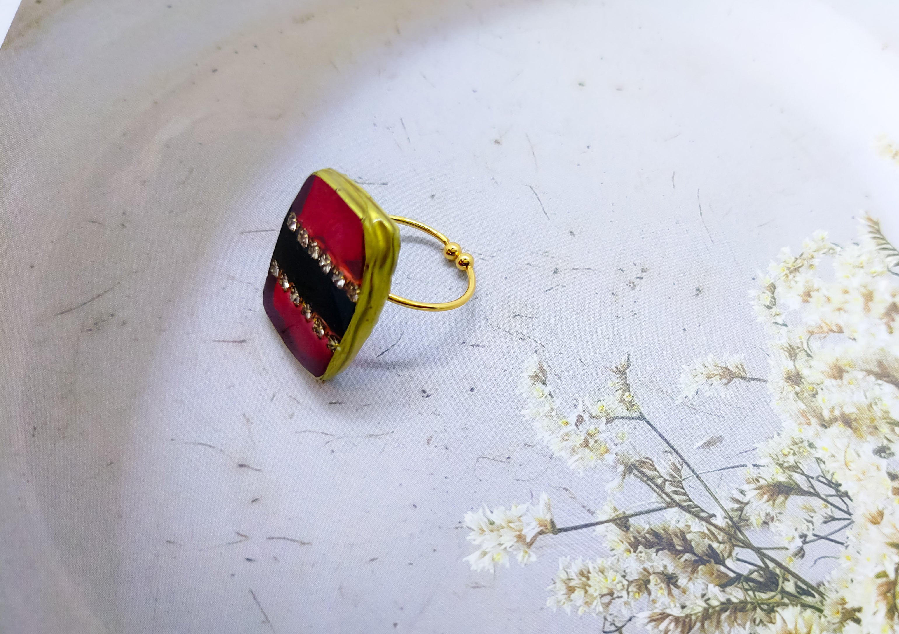 隕石の粉とラインストーンチェーンを使ったフリーサイズリング。