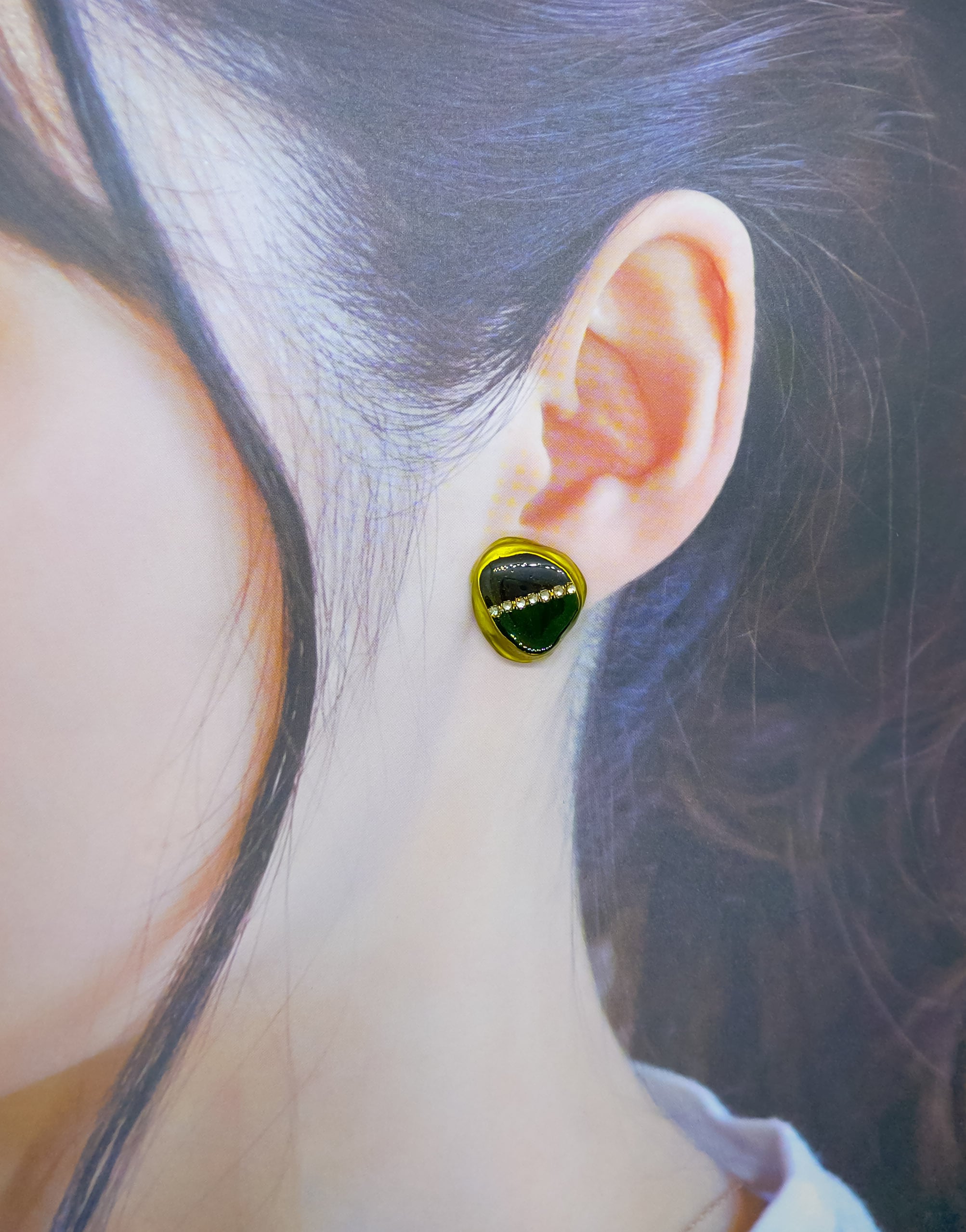 チャームの半分を落ち着いた緑のうぐいす色に着色し、ラインストーンを埋め込み、シンプルでありながらも華やかさもあるピアスに仕上げました。