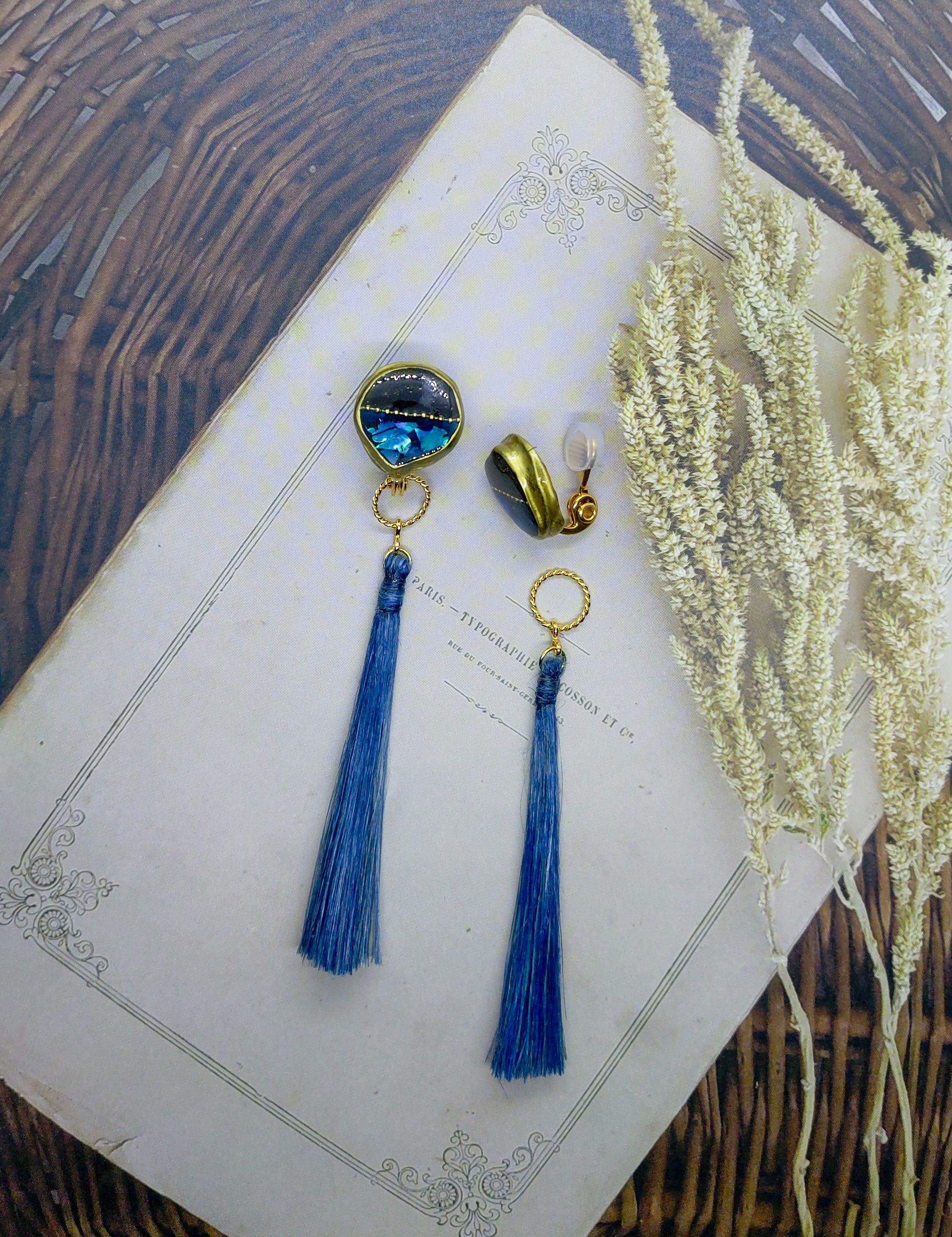 隕石の粉を封入し、藍染めで深い青色に染めた精麻タッセルを組み合わせたイヤリング。