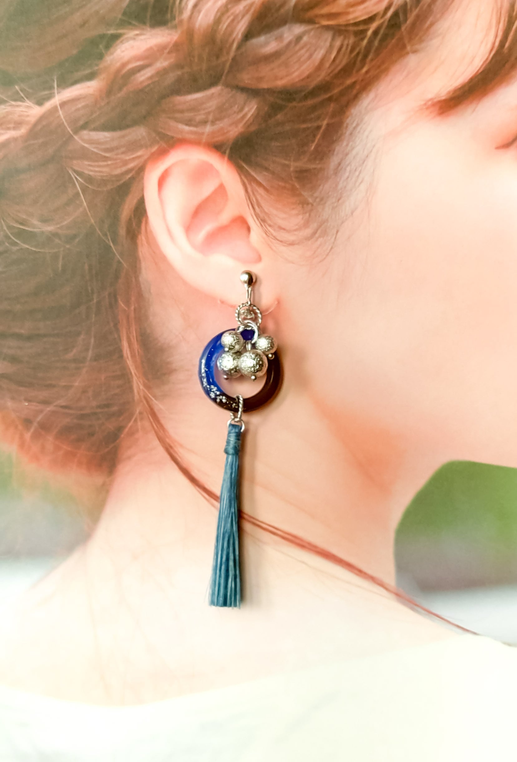 隕石の粉をフープに封入し、藍染めで深い青色に染めた精麻タッセルと繊細な輝きのスターダストボールを組み合わせた華やかなシルバーイヤリング。