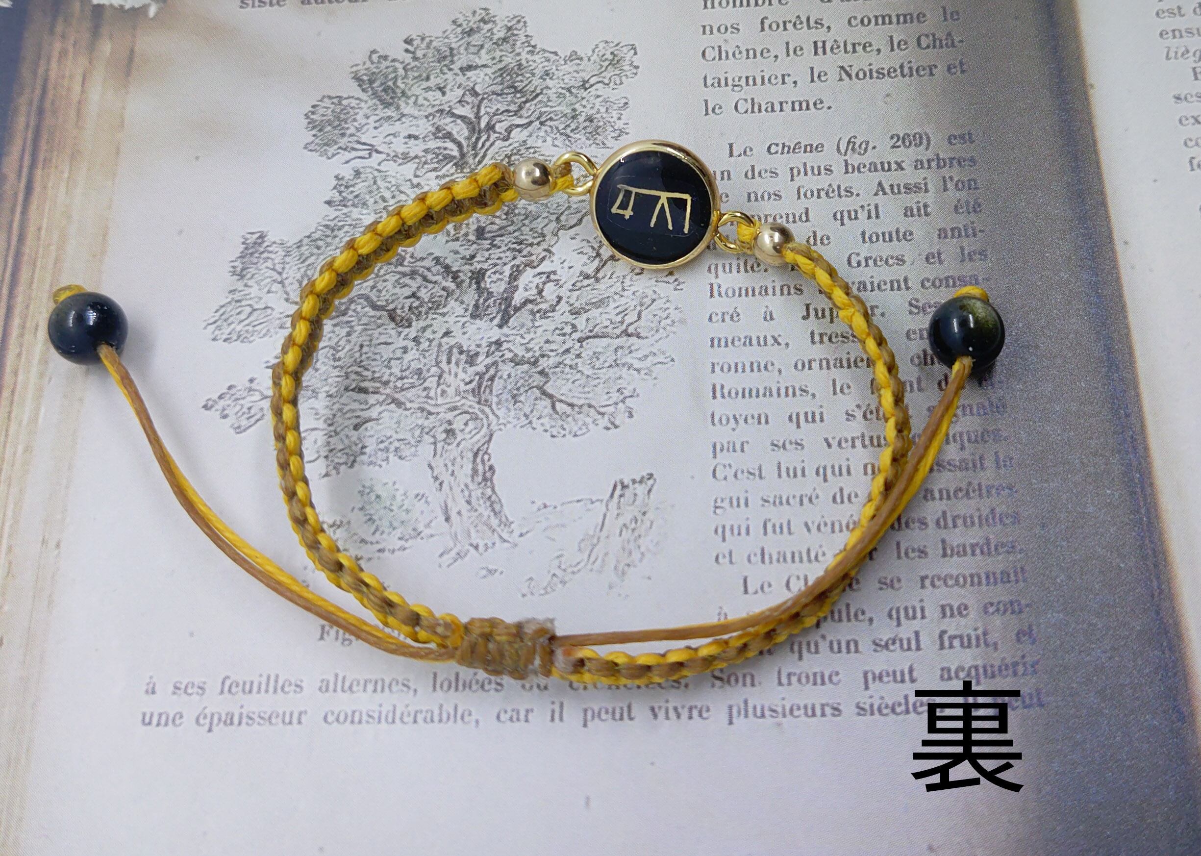 隕石と黒曜石の麻編み言靈ブレスレット(龍体文字 “く“)【チャーム小 12mm】