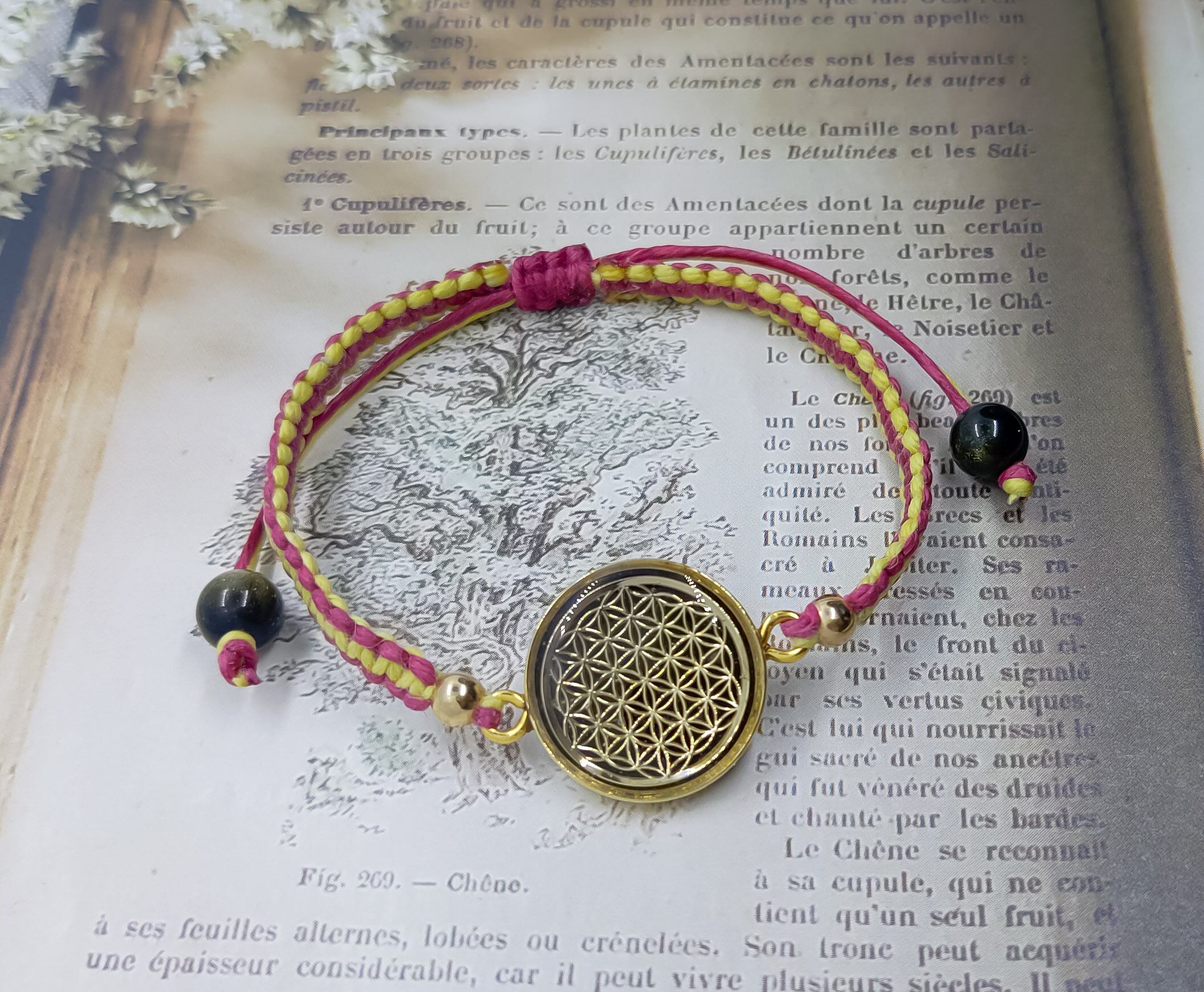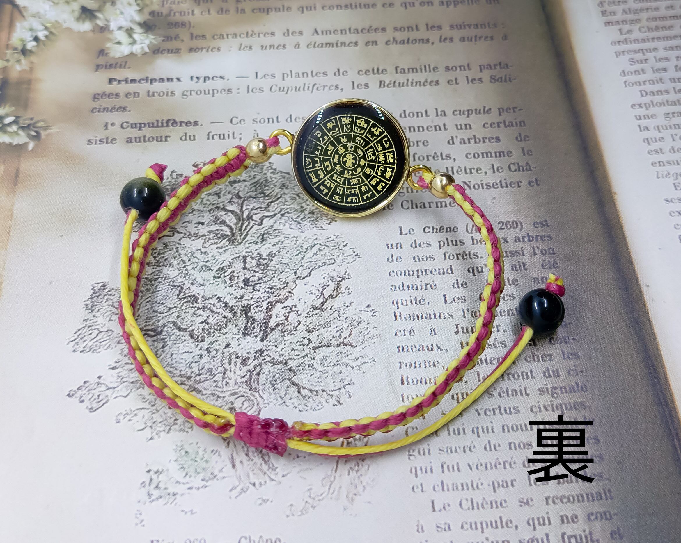 美と女性性をあらわす牡丹色(マゼンタ)と、クリームイエローの麻紐で編み、ブレスレットにしました。